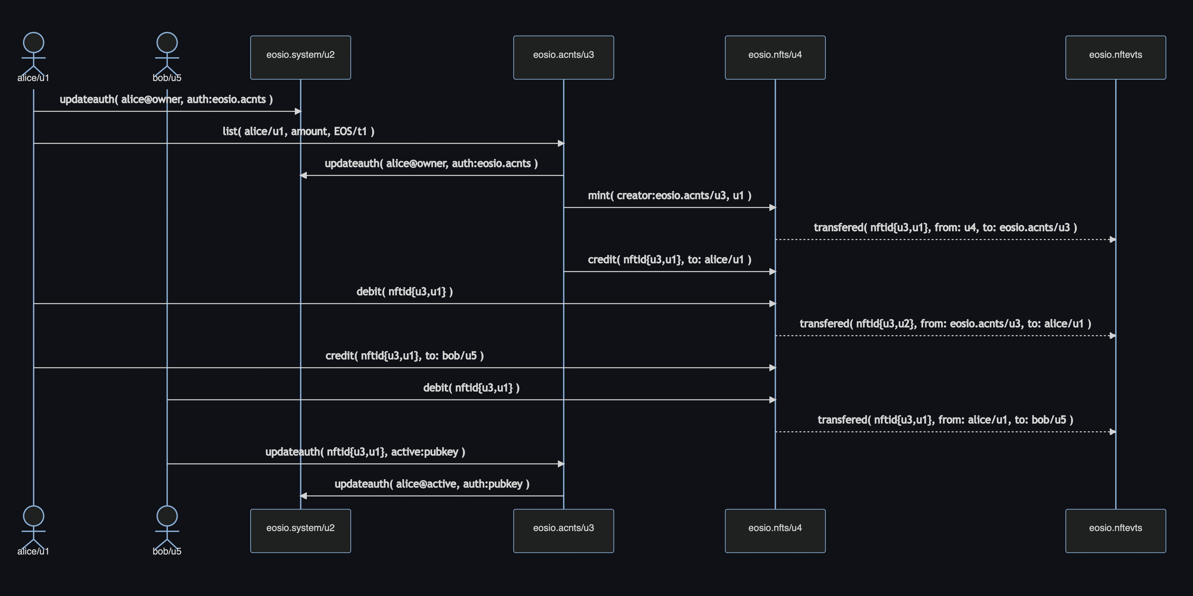 The following diagram shows how the new NFT standard can facilitate trading of accounts on any DeFi application that supports the new standard. This means that accounts, issuer permissions, symbol names, and premium account names can all be used as DeFi collateral.